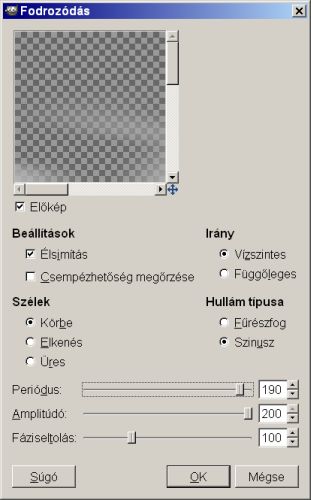 7. lépés: torzításA Képablakban a Szűrők / Torzítás / Fodrozódás menüpontot választjuk és megtesszük a beállításainkat - én az ablak alső részén változtattam meg a Periódus-t, Ampitúdó-t és Fáziseltolódást, a többi változatlan maradt: